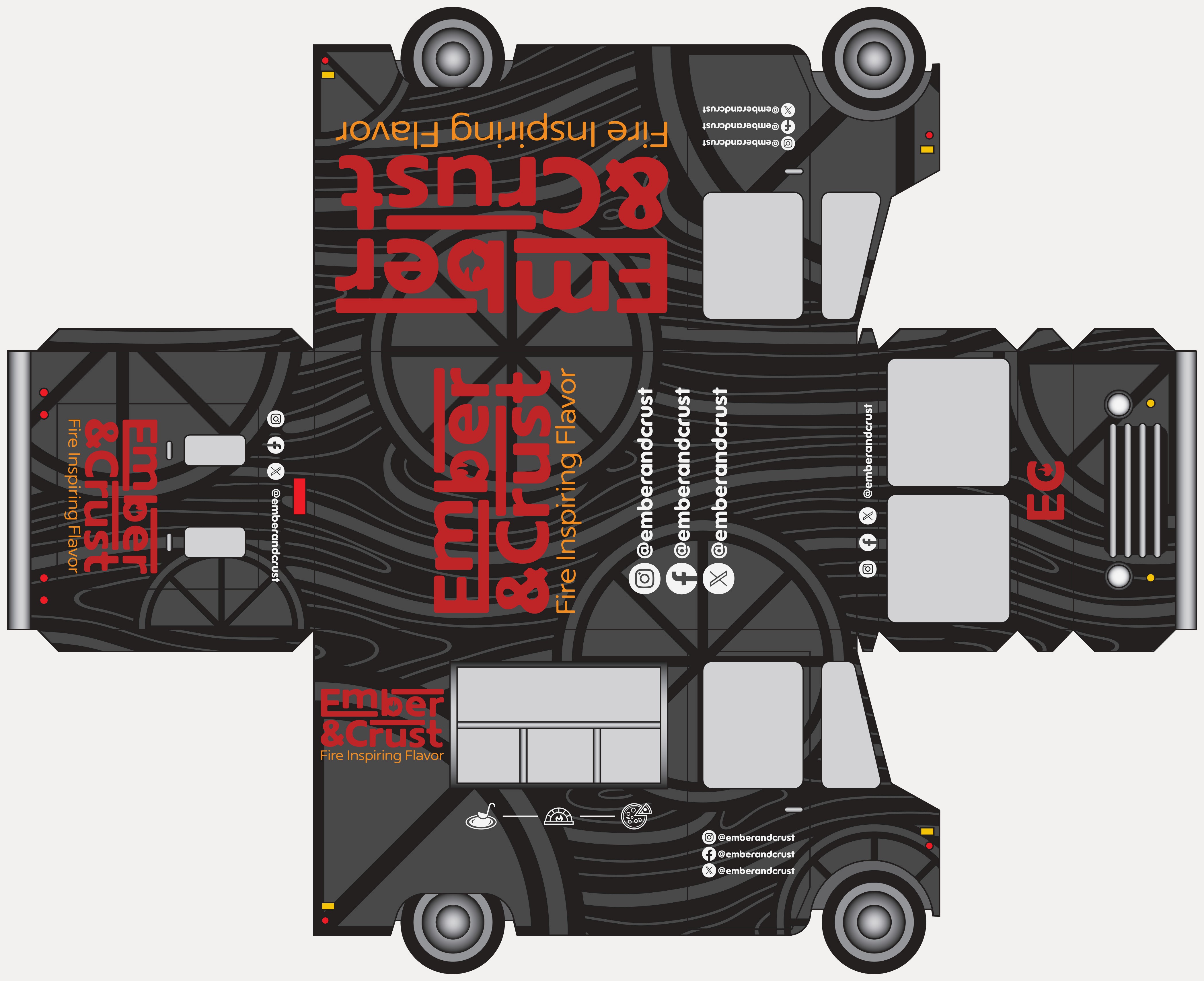Ember and Crust is a fictitious food truck I created for the food truck project in my Art Direction I class. We were tasked with creating a business summary, mood board, responsive logos, a truck wrap, a food menu, and a 3D model.